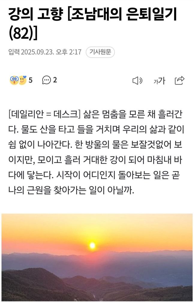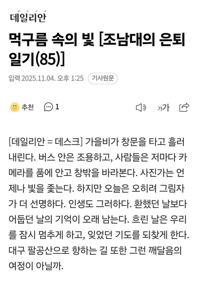 지난 십여 년 동안 연재를 이어왔다. 마감 시간에 쫓길 때면 마음이 조마조마했지만, 보람도 컸다. 한 번의 펑크도 없었기에 나만의 자부심이었다. 요즘 들어 문득, 퍼내기만 한 우물이 바닥을 드러내는 것은 아닌가 하는 생각이 들곤 한다. 문장이 예전처럼 흘러나오지 않고, 단어 하나를 붙잡고 맴도는 날이 잦아졌다. ‘이제는 내려놓아야 할지도 모르겠다’라는 불안이 어둑한 그림자처럼 따라다닌다.
