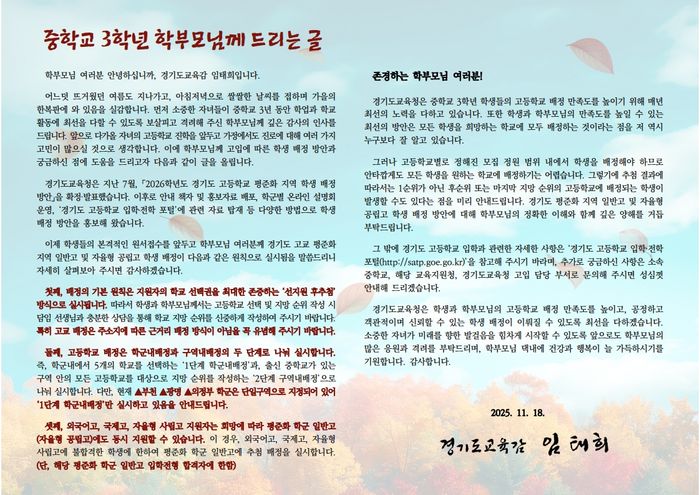 도교육청은 이번 서한문 배포가 다음 달 원서접수를 앞둔 중3 학부모의 경기도 평준화 지역 일반고 및 자율형 공립고 학생 배정 방안에 대한 이해를 돕고, 학교 지망 순위 작성에 신중을 기하는 것에도 도움이 될 것을 기대하고 있다.