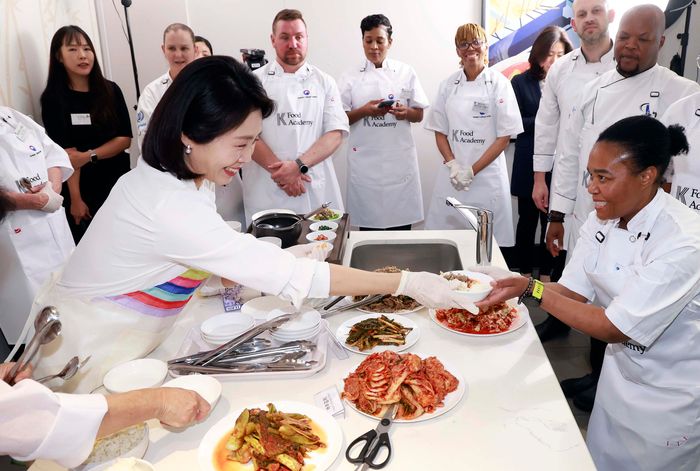 김혜경 여사는 23일(한국시각) 남아공 요하네스버그의 주남아공 한국문화원에서 '남아공 햇살 아래 익어가는 한식의 맛과 지혜'를 주제로 현지 셰프들과 만났다. 이 자리에서 김 여사는 남아공 현지 셰프들 앞에서 직접 된장찌개를 끓이고, 김치를 찢어주며 권했다.