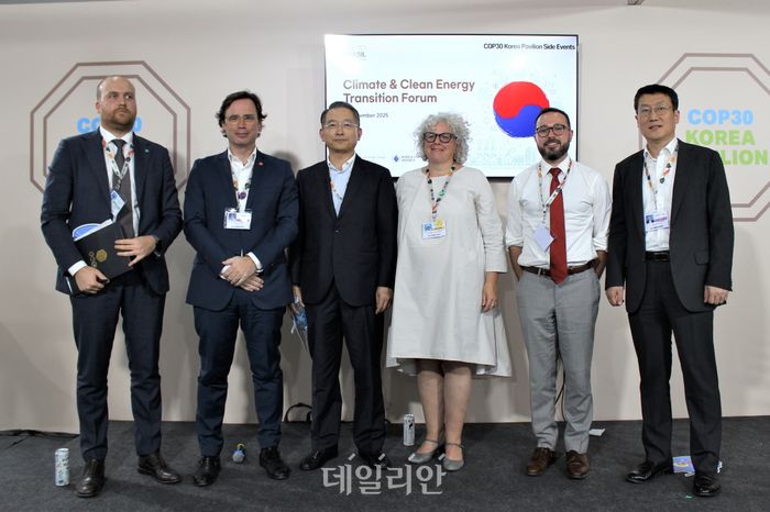 브라질 현지 시각 17일(월) COP30 한국홍보관에서 개최한 ‘기후·청정에너지 전환 포럼’에서 (왼쪽부터) 글로벌녹색성장연구소(GGGI) 페루치오 산테티 라틴아메리카(LAC) 지역이사, 포르투갈의 넬슨 라지 에너지청장, 한국에너지공단 신부남 기후행동이사, 국제재생에너지정책네트워크(REN21) 라나 아디브 사무총장, 국제에너지기구(IEA) 루카 로레 기후정책 분석가, 한국에너지공단 이상훈 이사장이 기념촬영을 하고 있다. ⓒ한국에너지공단