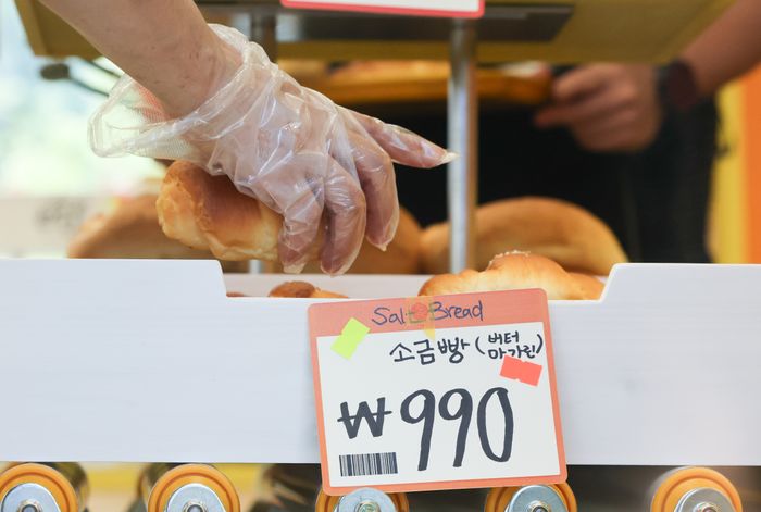 지난 9월 2일 오전 서울 성동구 글로우 성수에 마련된 유튜버 '슈카월드'의 베이커리 팝업 스토어 ETF베이커리를 찾은 시민들이 990원에 판매되는 소금빵을 고르고 있다.ⓒ뉴시스