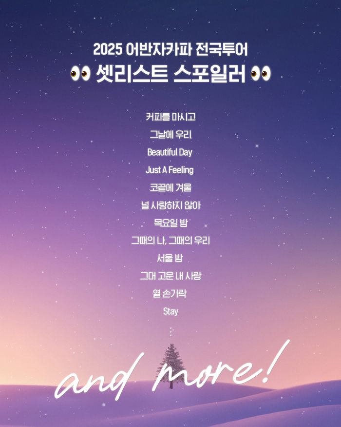 어반자카파 공식 SNS계정을 통해 공개된 전국투어콘서트의 셋리스트 이미지에는 데뷔곡 ‘커피를 마시고’를 시작으로 ‘그날에 우리’, ‘뷰티플 데이’(Beautiful Day), ‘저스트 어 필링’(Just A Feeling), ‘코끝에 겨울’, ‘널 사랑하지 않아’, ‘목요일 밤’, ‘그때의 나, 그때의 우리’, ‘서울 밤’, ‘그대 고운 내사랑’, ‘열 손가락’, ‘스테이’(Stay) 등 히트곡과 명곡을 포함한 총 12곡을 공개했다.