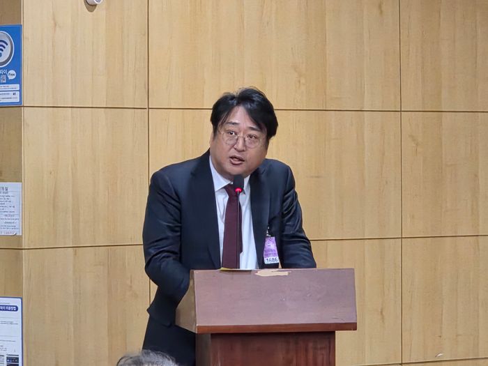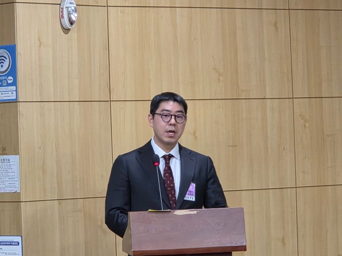 김형건 강원대 경제통계학부 교수가 18일 국회의원회관 제2소회의실에서 열린 정책토론회 ‘석유유통시장 개선 방안: 알뜰주유소 정책의 한계와 과제’에서 ‘에너지전환시대, 알뜰주유소 정책의 재평가’를 주제로 발표하고 있다. ⓒ데일리안 정진주 기자