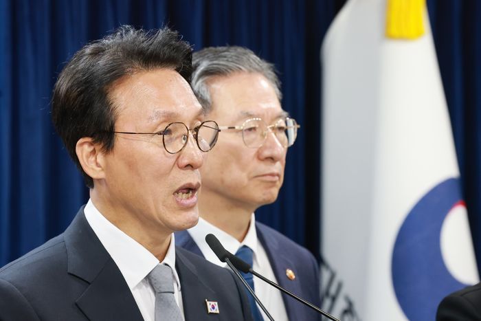 김민석 국무총리(왼쪽)가 18일 정부서울청사에서 '론스타 국제투자분쟁(ISDS) 취소 신청'과 관련해 긴급 브리핑을 하고 있다. 김 총리 오른쪽은 정성호 법무부 장관. ⓒ연합뉴스