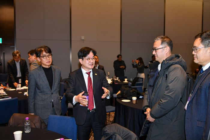 김병수(왼쪽 2번째) 김포시장이 2025 UAM 산업육성 전략포럼에서 참석자들과 대화를 나누고 있다. ⓒ 김포시 제공