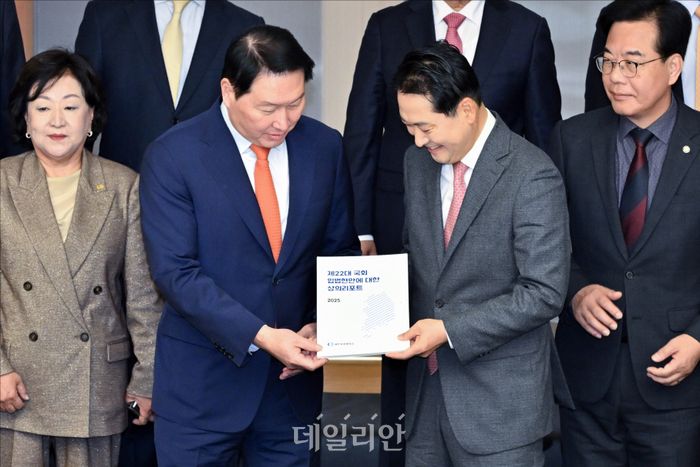 최태원 대한상의 회장이 19일 서울 중구 대한상공회의소 챔버라운지에서 열린 '국민의힘-대한상공회의소 정책간담회'에서 장동혁 대표에게 정책제안서를 전달하고 있다.