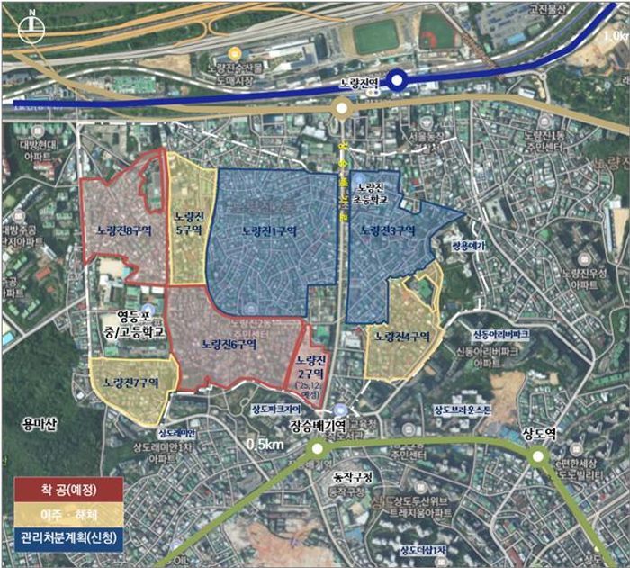 노량진 6·8구역은 착공했으며 4·5·7구역은 이주 및 해체, 1·3구역은 관리처분계획(신청) 단계에 있다.