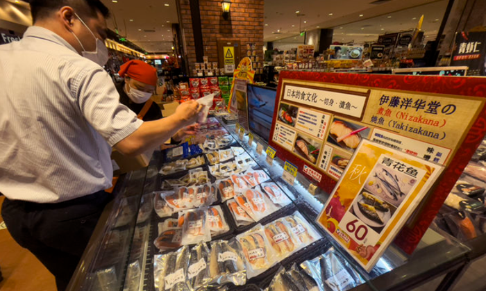 2023년 8월 24일 중국 베이징의 한 마트 수산물 코너에서 직원이 원산지를 확인하고 있다. ⓒAP/뉴시스