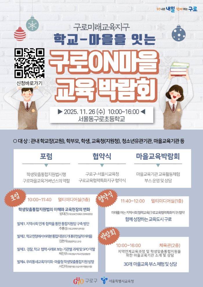 이번 박람회는 관내 초‧중‧고 교장 및 교원, 남부교육지원청 장학사, 관내 학교 어린이‧청소년, 유관기관, 마을교육기관 등 700여 명을 대상으로 ▲'학생맞춤통합지원법 시행, 구로마을교육거버넌스의 역할'을 주제로 한 토론회(포럼) ▲구로구청-서울특별시교육청 구로교육협력특화지구 협약식 ▲마을교육기관이 참여하는 교육체험부스 운영 및 상담 프로그램이 진행된다.