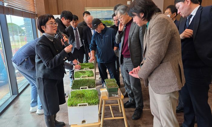 국립산림과학원의 배은지 임업연구사가 자체 개발한 신품종 한국잔디 9종 실물을 소개하고 있다. ⓒ 한국대중골프장협회