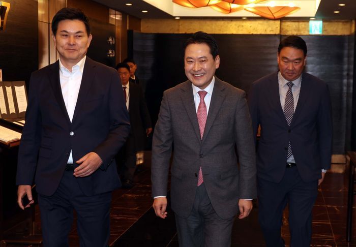 장동혁 국민의힘 대표가 19일 오후 서울 여의도의 한 식당에서 열린 중진의원 모임에 참석하고 있다. 왼쪽부터 김태호 의원, 장 대표, 정희용 사무총장 ⓒ뉴시스
