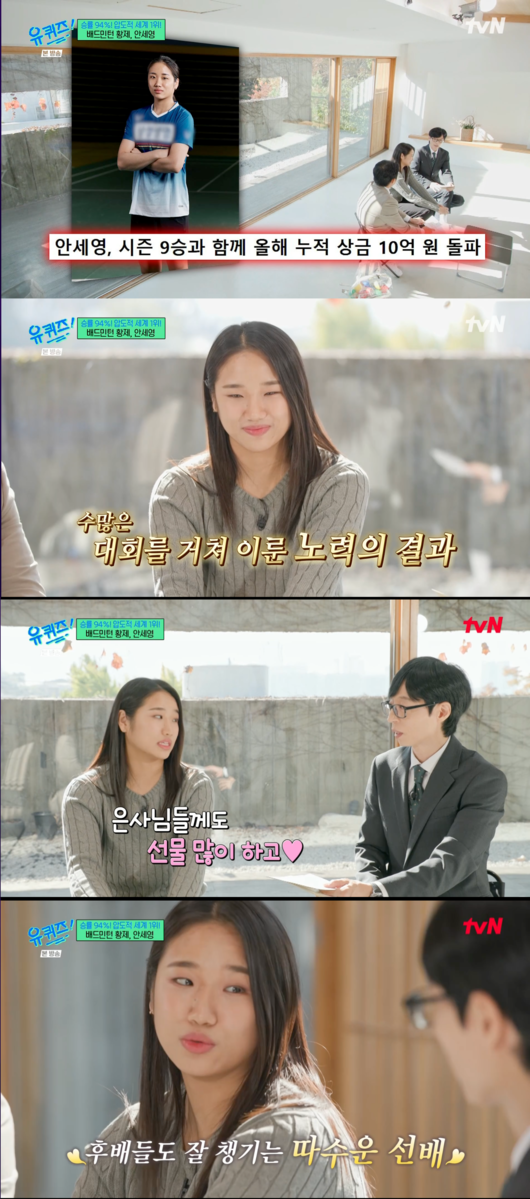 안세영은 19일 방송된 tvN ‘유 퀴즈 온 더 블록’에 출연해 "유럽 투어를 갔다 오고 지금 잠깐 쉬는 타임"이라고 근황을 전했다.