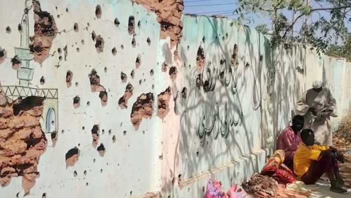 지난 3월 23일 수단 중부 옴두르만에서 난민들이 총탄 자국이 남아있는 담장 앞에 앉아 있다. ⓒAP/뉴시스