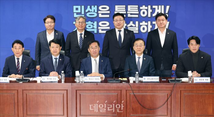 맹성규 국회 국토교통위원장, 김윤덕 국토교통부 장관 등 참석자들이 20일 서울 여의도 국회 의원회관에서 열린 당정협의회에서 기념촬영을 하고 있다.