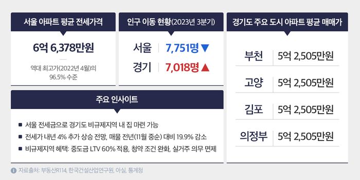 이처럼 전월세 부담이 커지면서 서울과 맞닿은 경기 주요 도시로 발길을 돌리는 수요자들이 늘고 있다. 통계청 자료를 보면 올 3분기 기준 서울 순이동은 –7751명으로 거주인구가 줄어든 반면 경기도는 7018명 늘었다. 서울에서 이탈한 인구 상당수가 경기도로 이주한 것으로 보인다.