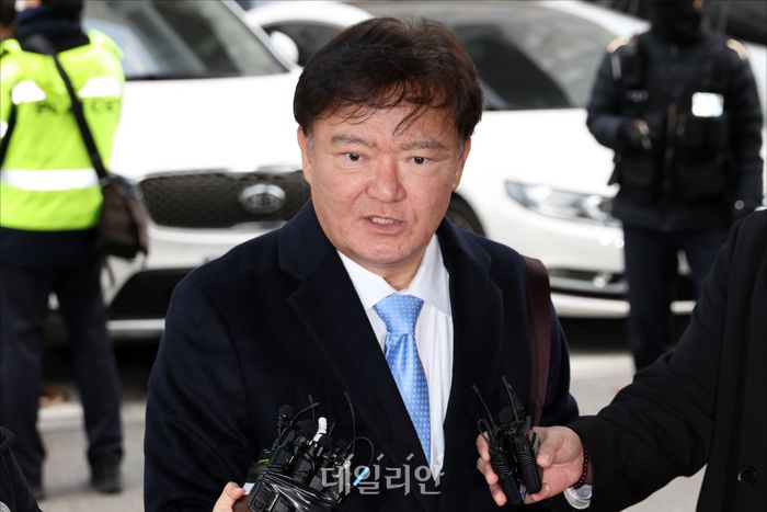 민경욱 전 의원이 20일 오후 서울 양천구 서울남부지방법원에서 열린 '자유한국당 패스트트랙(신속처리안건) 충돌 사건' 1심 선고 공판에 출석하기 전 취재진의 질문에 답변하고 있다.