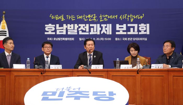 정청래 더불어민주당 대표가 20일 오후 서울 여의도 국회에서 열린 호남발전과제 보고회에서 발언을 하고 있다. ⓒ뉴시스