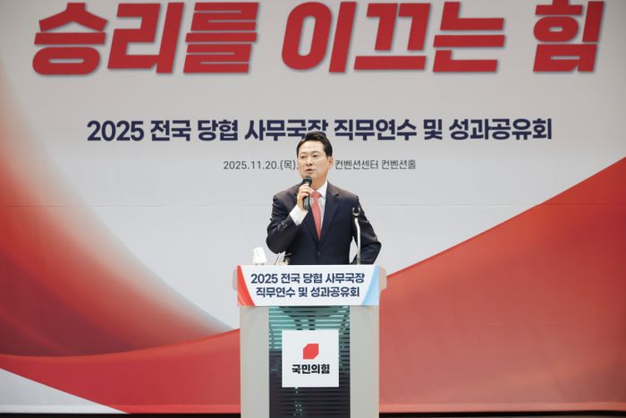 장동혁 국민의힘 대표가 20일 오후 서울 강남구 SETEC컨벤션센터에서 열린 2025 전국 당협 사무국장 직무연수 및 성과공유회에서 발언을 하고 있다. ⓒ국민의힘 제공