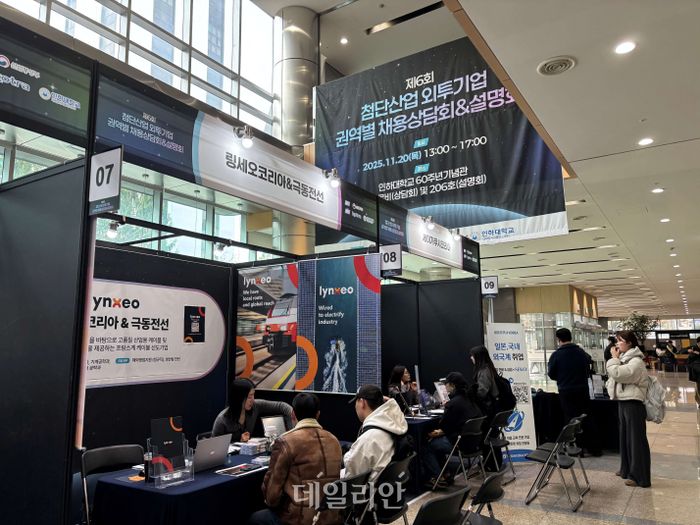 산업부와 KOTRA, 인하대학교 대학일자리플러스센터는 20일 인하대학교에서 ‘첨단산업 외투기업 권역별 채용 상담·설명회’를 개최했다. 인하대학교 60주년기념관에 마련된 기업별 채용 부스의 모습. ⓒ대한무역투자진흥공사
