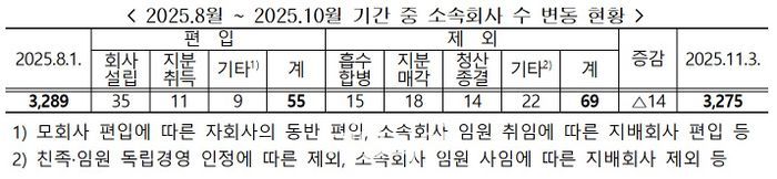 2025년 8~10월 기간 중 소속회사 수 변동 현황.ⓒ공정거래위원회
