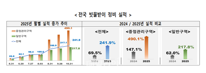 전국 408만여 개소를 대상으로 정비를 실시한 결과, 현장 점검과 민원 처리 등을 통해 정비 실적은 지난해보다 크게 증가했다. 10월 말 기준 올해 빗물받이 정비율은 241.9%이며, 침수 우려 지역으로 지정된 중점관리구역(36만여 개소)의 정비율은 490.1%로 지난해 대비 약 3.5배 상승했다. 이는 빗물받이 1개소당 평균 2.4회 이상 점검 또는 청소가 이뤄졌음을 의미한다.