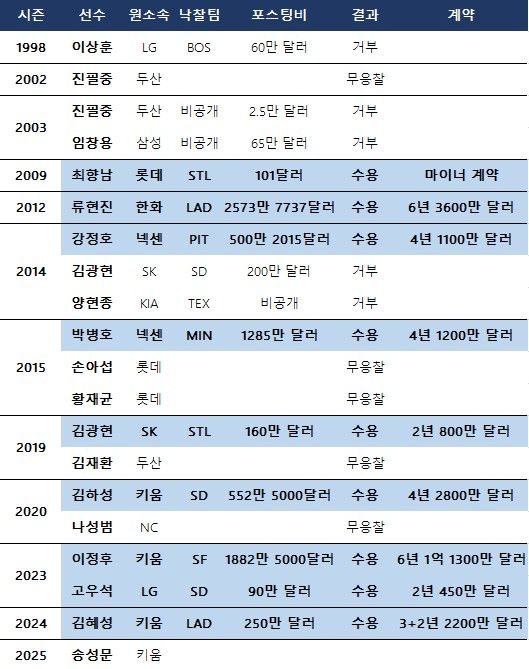 한동안 뜸했던 포스팅은 2019년 김광현이 두 번째 도전 만에 세인트루이스와 입단 계약을 맺었고, 2020년에는 김하성, 2023년에는 이정후와 고우석, 그리고 지난해 김혜성이 미국행 꿈을 이뤘다.