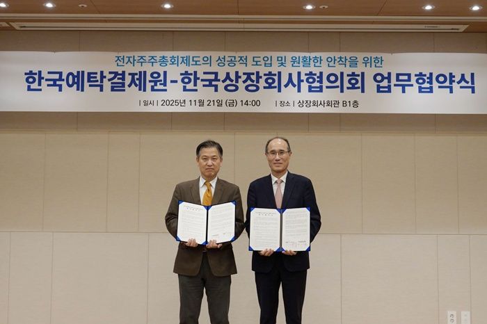 21일 예탁원에 따르면 이번 MOU는 ▲전자주총 관련 법령 제·개정 시 관련 쟁점 공동 대응 ▲전자주총 플랫폼을 통한 시범 전자주주총회 공동 개최 ▲전자주총 플랫폼 구축 및 안정화를 위한 상장회사 의견 수렴·테스트 협력 ▲전자주총 실무교육 공동 진행 ▲상장회사 주총 분산 자율준수 프로그램 연계 인센테브 공동 발굴 등의 내용이 담겼다.