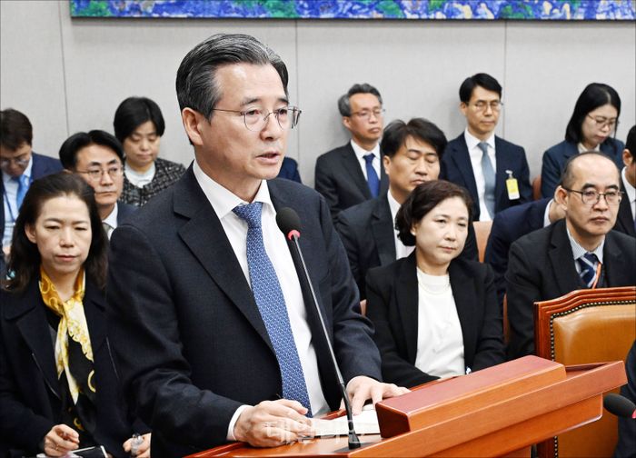 김용범 대통령실 정책실장이18일 서울 여의도 국회에서 열린 국회 운영위원회 전체회의에서 2026년도 예산안 관련 제안설명을 하고 있다.