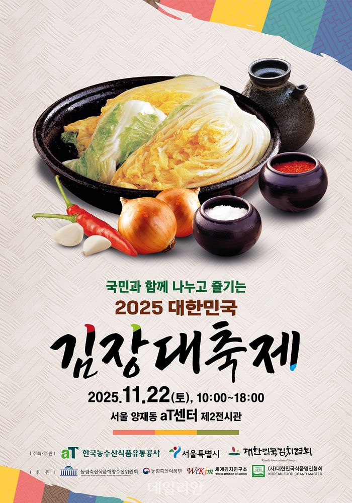 한국농수산식품유통공사 aT는 22일 서울 aT센터 제2전시장에서 서울시·대한민국김치협회와 함께 ‘2025 대한민국 김장대축제’를 연다.
