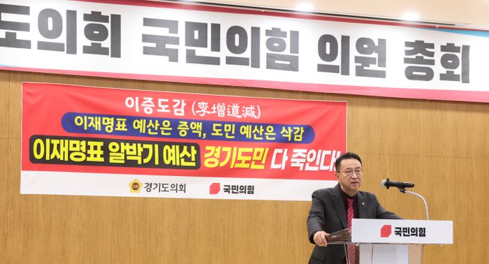 한편 국힘은 이날 의총에 이어 기자회견을 열고 경기도의 복지예산 삭감에 "2026년도 경기도 본예산안은 경기도를 망치는 이증도감(李增道減‧이재명표 예산은 증액, 도민 예산은 삭감)"이라며 "경제 전문가라는 경기도지사가 도 예산을 정부에 갖다 바쳤다"며 규탄했다.