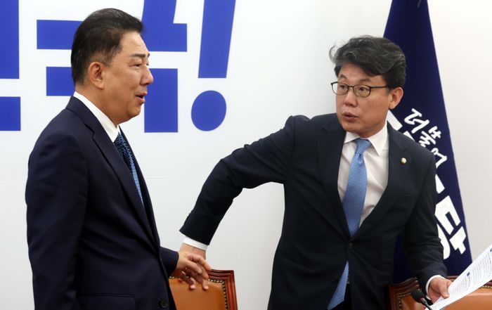 김병기 더불어민주당 원내대표와 진성준 의원이 국회에서 열린 정책조정회의에서 대화를 하고 있다. ⓒ뉴시스