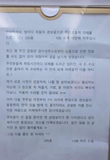 사과문을 작성한 차주 B씨는 "최근 몇 주간 경찰과 관리사무소에서 항의를 수도 없이 받아 귀찮아서 이렇게 글을 남기게 됐다"고 알렸다. 이어 "취침 시간마다 주민분들께 피해를 드리는 걸 안다"고 잘못을 인정하면서도 "내 돈 수십만원 들여 차를 수리하는 건 솔직히 아까운 거 아시지 않느냐"고 되물었다.