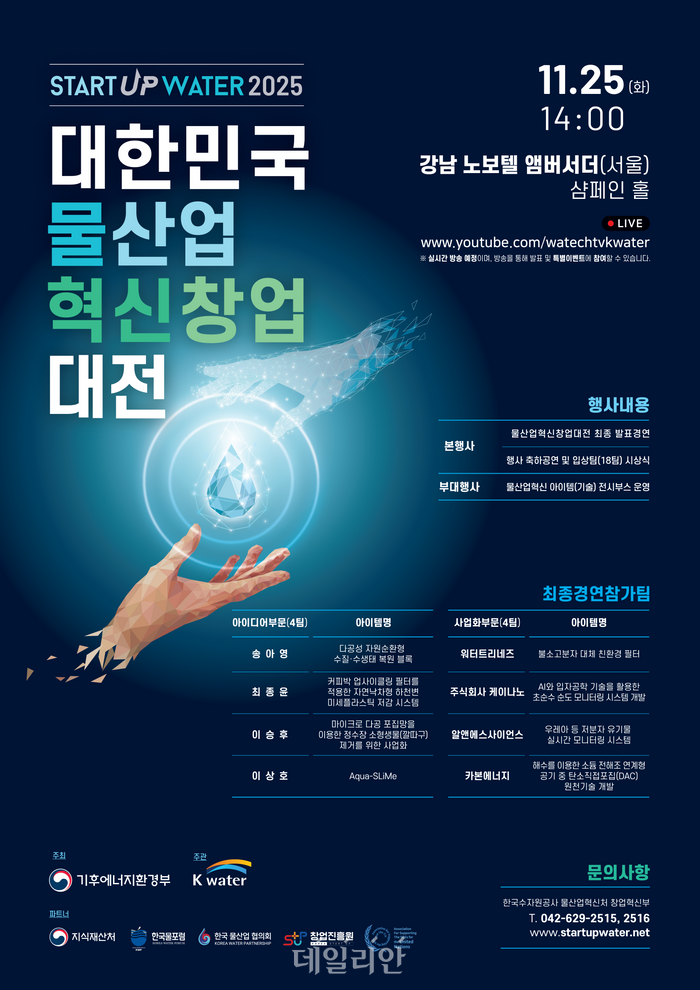 기후에너지환경부와 한국수자원공사는 물산업을 새로운 성장동력으로 키울 ‘혁신형 고성장 기업(유니콘)’을 발굴하기 위해 25일 노보텔앰버서더호텔에서 ‘대한민국 물산업 혁신 창업대전 2025’ 최종 경연을 연다.