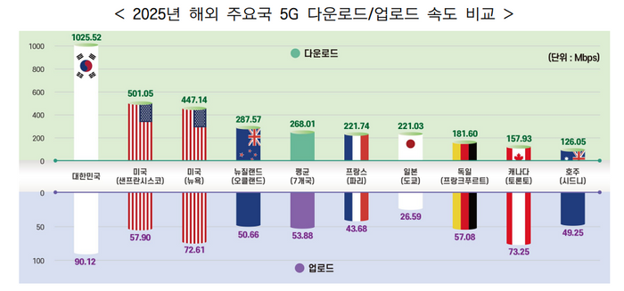 국내 통신 3사 평균 다운로드 속도는 1025.52Mbps(2024년 기준)로 조사 대상국 중 가장 빠른 미국(샌프란시스코, 501.05Mbps)과 비교해도 2배 이상 높았다.