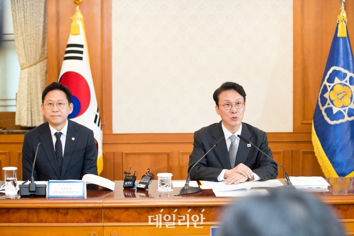 김민석 국무총리(오른쪽)가 24일 서울 종로구 정부서울청사 본관 대회의실에서 열린 제1회 과학기술관계장관회의에서 발언을 하고 있다.ⓒ과학기술정보통신부