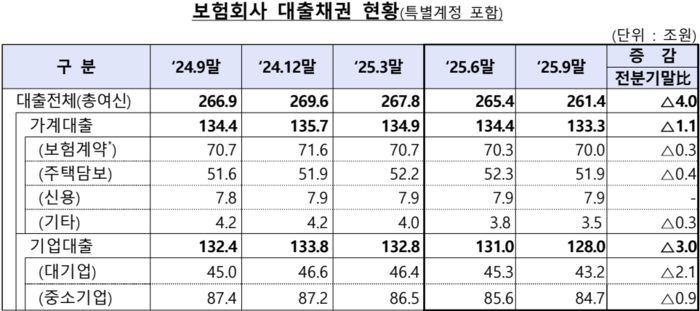 25일 금융감독원이 발표한 ‘2025년 9월 말 보험회사 대출채권 현황’에 따르면 9월 말 전체 대출채권 잔액은 261조4000억원으로 전분기 말(265조4000억원) 대비 4조원 줄었다.