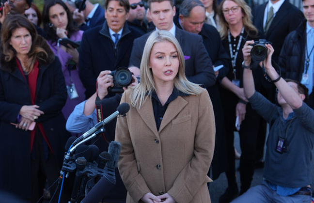 캐롤라인 레빗 미국 백악관 대변인이 24일(현지시간) 워싱턴DC 백악관에서 기자회견을 하고 있다. ⓒAP/뉴시스