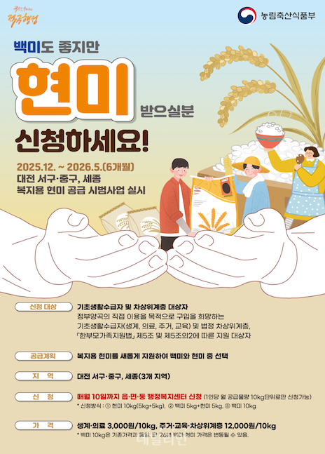 농림축산식품부는 12월부터 2026년 5월까지 6개월간 복지용 현미 공급 시범사업을 대전 서구·중구, 세종시 3개 지역에서 시행한다.