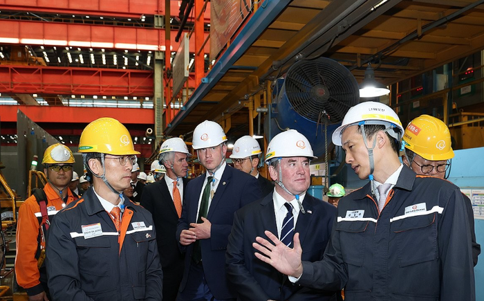 김동관 한화그룹 부회장(오른쪽)이 지난 6월 30일 한화오션 거제사업장에서 존 펠란 미 해군성 장관(오른쪽 두 번째)에게 선박 블록 조립공장을 소개하고 있다.ⓒ한화오션
