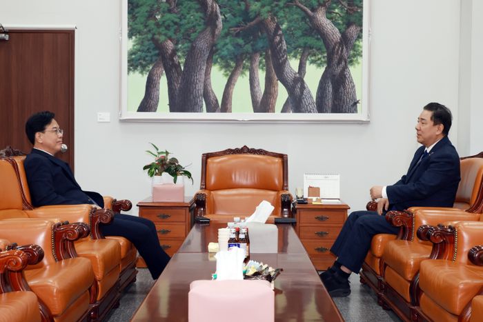 김병기 더불어민주당 원내대표(오른쪽)와 송언석 국민의힘 원내대표(왼쪽)가 25일 서울 여의도 국회에서 회동을 하고 있다. ⓒ뉴시스