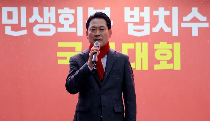 장동혁 국민의힘 대표가 25일 경북 구미시 구미역 광장에서 열린 민생회복 법치수호 국민대회에서 발언하고 있다. ⓒ 뉴시스