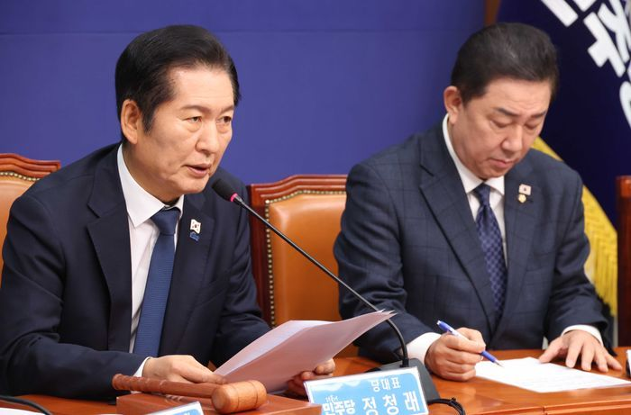 정청래 더불어민주당 대표가 지난 24일 오전 국회에서 열린 최고위원회의에서 발언을 하고 있다. ⓒ뉴시스