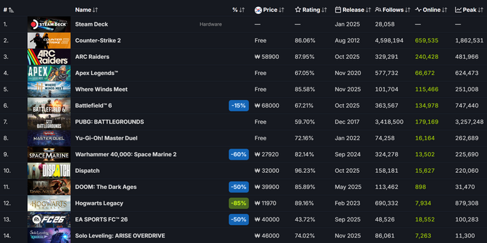 27일 PC 플랫폼 스팀 DB에 따르면, 넥슨 '아크 레이더스'는 글로벌 최고 판매 게임 3위를 유지하며 꾸준한 기세를 이어가고 있다. 24시간 최대 동시접속자는 48만1966명으로 가장 많이 실행된 게임(Most played games) 3위에 이름을 올렸다. 신규 IP임에도 '카운터 스트라이크2', '도타2', '배틀필드6' 등 글로벌 흥행작들과 어깨를 나란히하고 있는 셈이다.