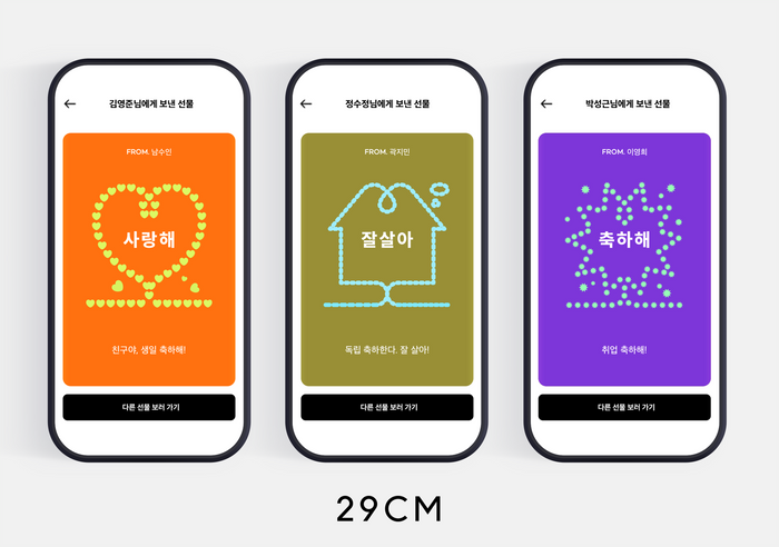 29CM 관계자는 “29선물하기를 찾는 고객들은 선물을 주고받는 과정에서 서로의 취향을 공유할 수 있는 트렌디하고 감각적인 아이템을 선호하는 경향이 뚜렷하다”며 “브랜드와 협업해 신규 색상과 전용 패키지를 선보이며 선물 선택의 고민을 덜어주는 한편 고객 맞춤형 큐레이션 기능을 강화해 고르는 과정의 편의성을 높이고 있다”고 말했다.