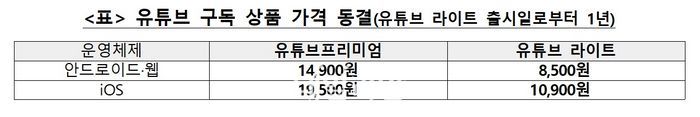 유튜브 라이트의 가격은 안드로이드·웹 기준 8500원, iOS 기준 1만900원이 될 예정이다.
