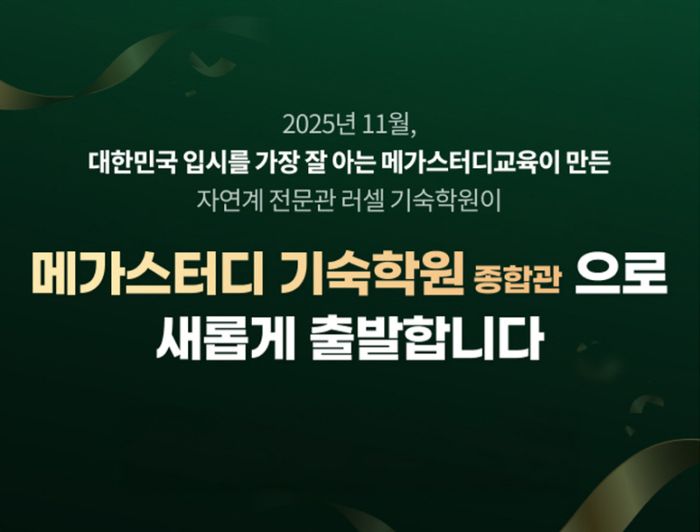 기숙학원 관계자는 “메가스터디 기숙학원 종합관은 메가스터디교육이 만든 대입 전문 오프라인 학습 공간으로, 기존 러셀 기숙 자연계 전문관에서 학원명을 변경하고 새로운 도약을 시작한다”며 “우수한 강사진과 입시 전문가, 양질의 콘텐츠, 프리미엄 시설, 풍성한 장학제도 등 오랜 경험과 데이터에 기반한 대입 성공 노하우를 제공할 것”이라고 밝혔다.