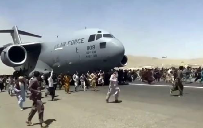 2024년 8월 20일 아프가니스탄의 한 공항에서 미군 항공기에 탑승하지 못한 아프간인들이 활주로를 달리고 있다. ⓒAP/연합뉴스