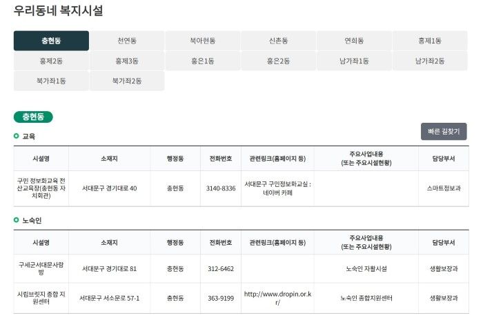 지역별 복지시설을 일목요연하게 정리한 서대문구 홈페이지ⓒ서대문구 제공