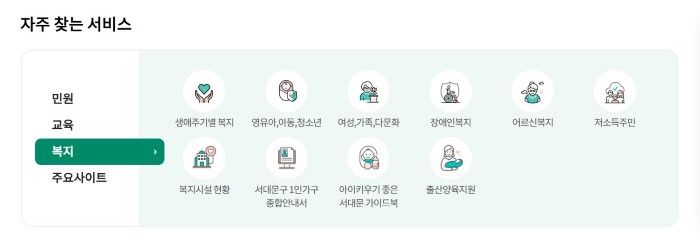 홈페이지 하단 '자주 찾는 서비스 – 복지' 항목에 주민 수요가 높은 복지 서비스를 10개(영유아·아동·청소년, 여성·가족·다문화, 장애인, 어르신, 저소득, 1인가구, 츨산양육 등)로 분류해 놓았는데 해당 이미지를 클릭하면 세부 내용을 볼 수 있는 화면으로 바로 이동한다.
