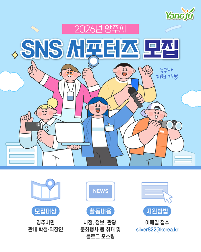 경기 양주시는 시민과 소통하며 양주의 시정과 숨은 매력을 널리 알리는 '2026년 양주시 SNS 서포터즈'를 오는 12월 1일부터 10일까지 10일 동안 모집한다고 밝혔다.